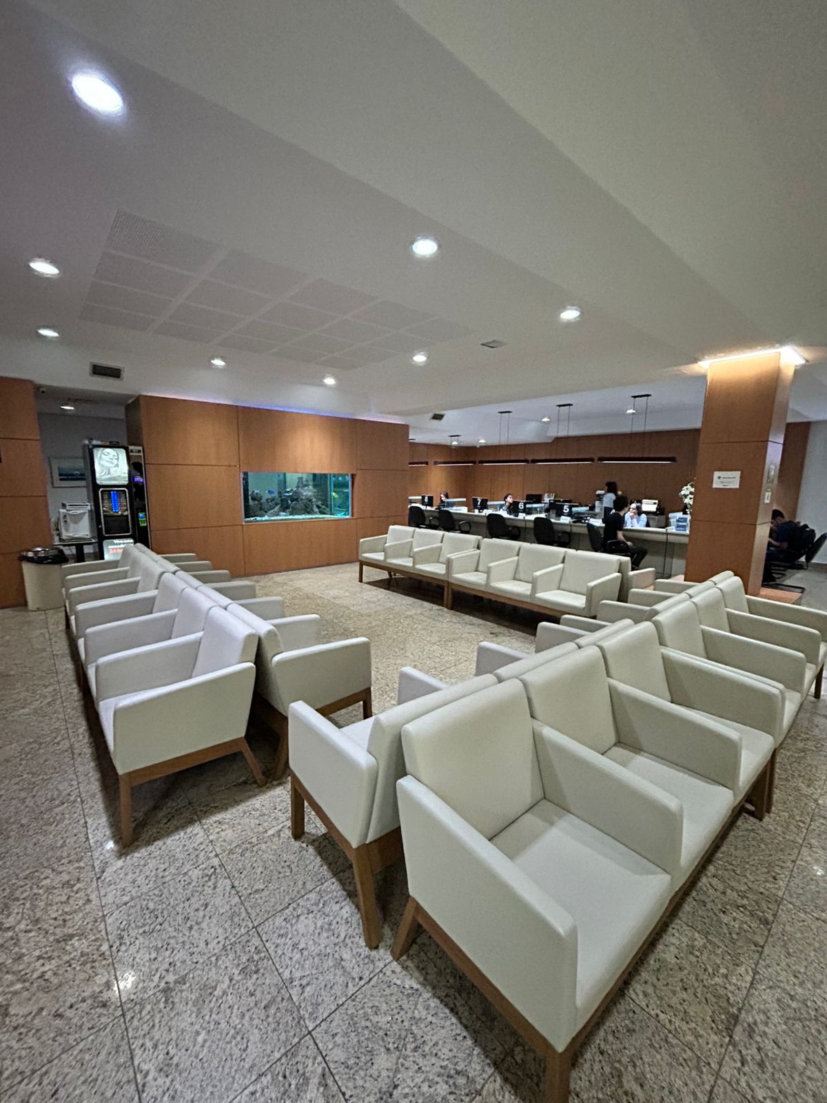 Um moderno edifício comercial de vários andares com uma fachada de vidro azul espelhado e detalhes em branco e cinza. Em frente à entrada principal, há várias motocicletas estacionadas. Uma pessoa está sentada perto da entrada. Árvores e vegetação são visíveis nas laterais do edifício e sob um céu azul claro com algumas nuvens.    Um edifício moderno de escritórios, com fachada de vidro e detalhes em branco e cinza, sob um céu azul. Há folhagens na parte inferior e uma torre de telecomunicações distante no lado direito.   O interior de um saguão moderno e espaçoso com uma recepção escura à esquerda, onde uma pessoa está sentada. Há uma parede escura texturizada atrás do balcão. O piso é de mármore claro e brilhante. À direita, há uma parede de pedra ou mármore clara com uma fonte ou característica de água. Ao fundo, uma escada e catracas são visíveis, com reflexos de luz do lado de fora.