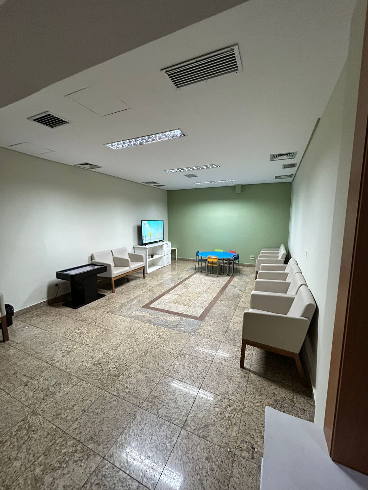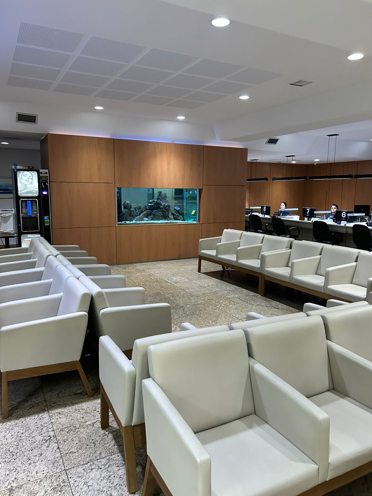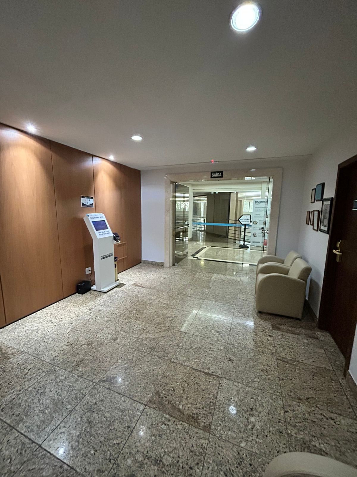 Um moderno edifício comercial de vários andares com uma fachada de vidro azul espelhado e detalhes em branco e cinza. Em frente à entrada principal, há várias motocicletas estacionadas. Uma pessoa está sentada perto da entrada. Árvores e vegetação são visíveis nas laterais do edifício e sob um céu azul claro com algumas nuvens.    Um edifício moderno de escritórios, com fachada de vidro e detalhes em branco e cinza, sob um céu azul. Há folhagens na parte inferior e uma torre de telecomunicações distante no lado direito.   O interior de um saguão moderno e espaçoso com uma recepção escura à esquerda, onde uma pessoa está sentada. Há uma parede escura texturizada atrás do balcão. O piso é de mármore claro e brilhante. À direita, há uma parede de pedra ou mármore clara com uma fonte ou característica de água. Ao fundo, uma escada e catracas são visíveis, com reflexos de luz do lado de fora.